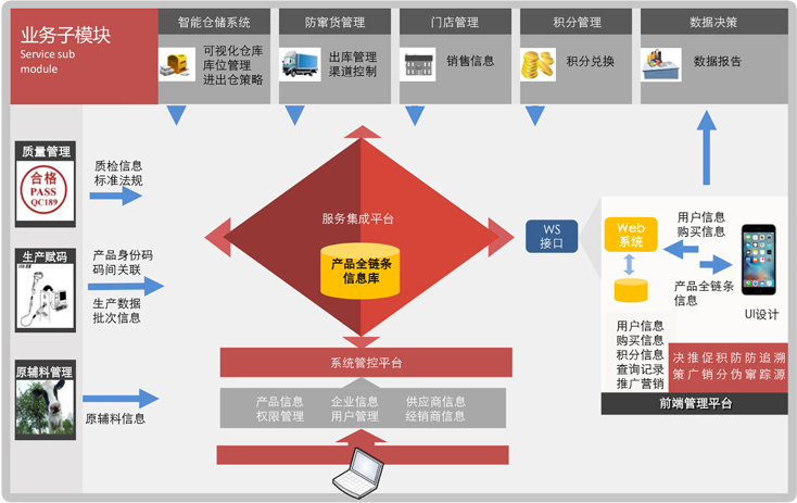 產品流通環節管理,針對不同的企業定制追蹤溯源結構,根據企業不同需求定制角色,分層次管理企業銷售、企業稽查、企業內管,經銷商、終端用戶等,精確至每件產品,定位于每件產品的流通環節,可單節點把控。